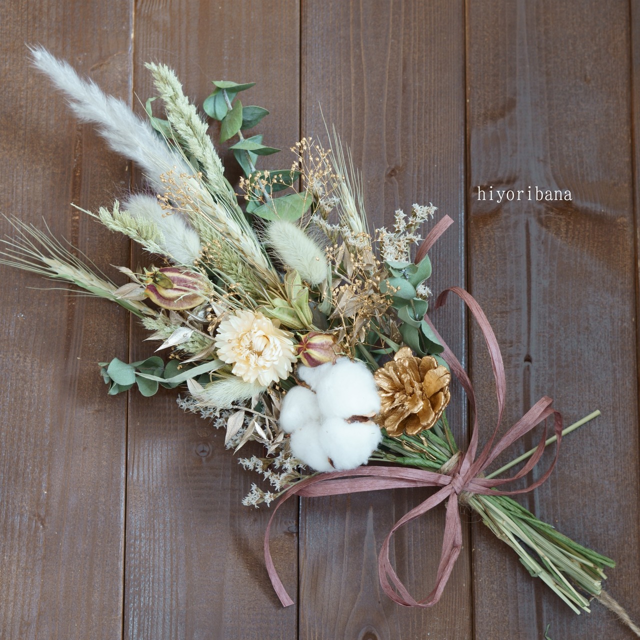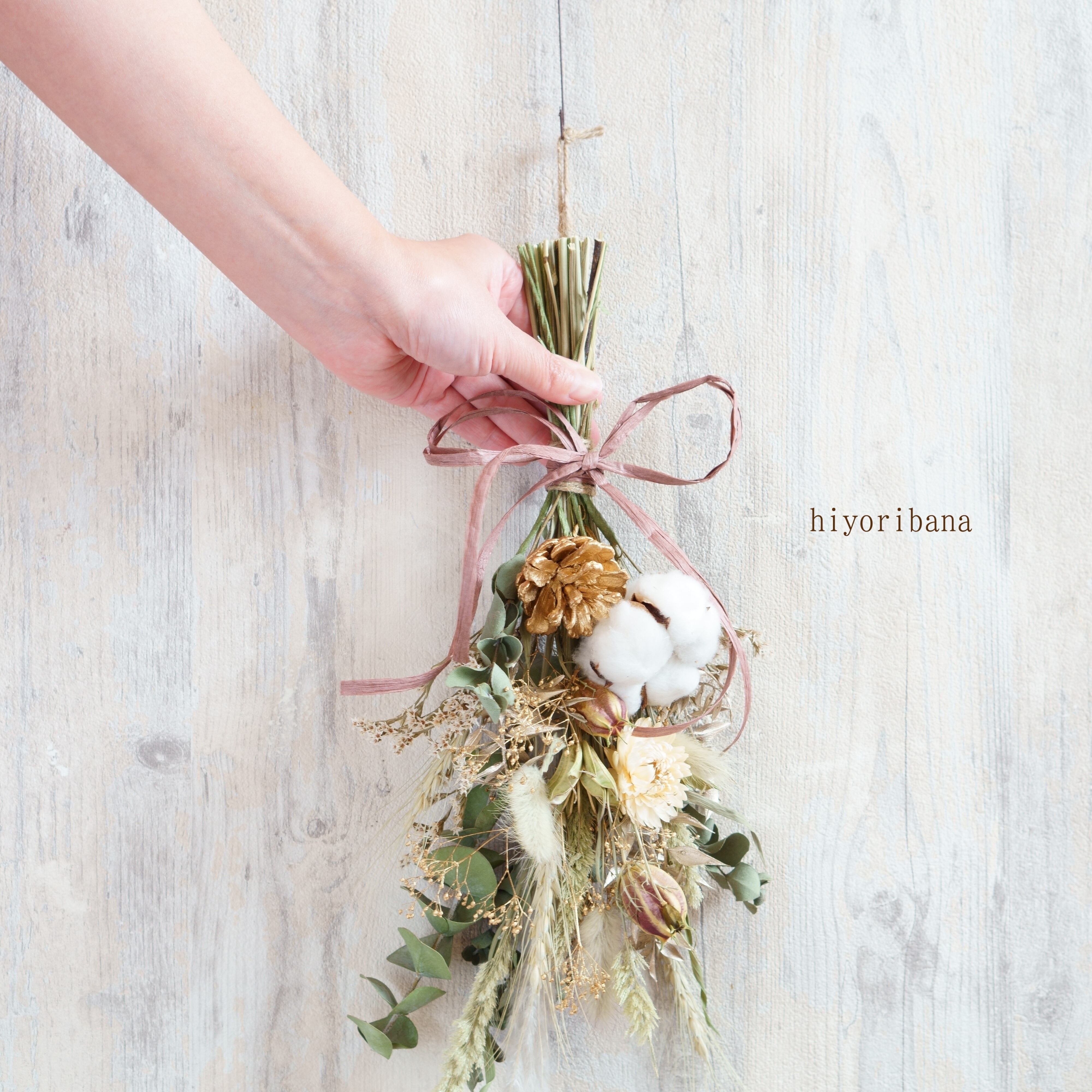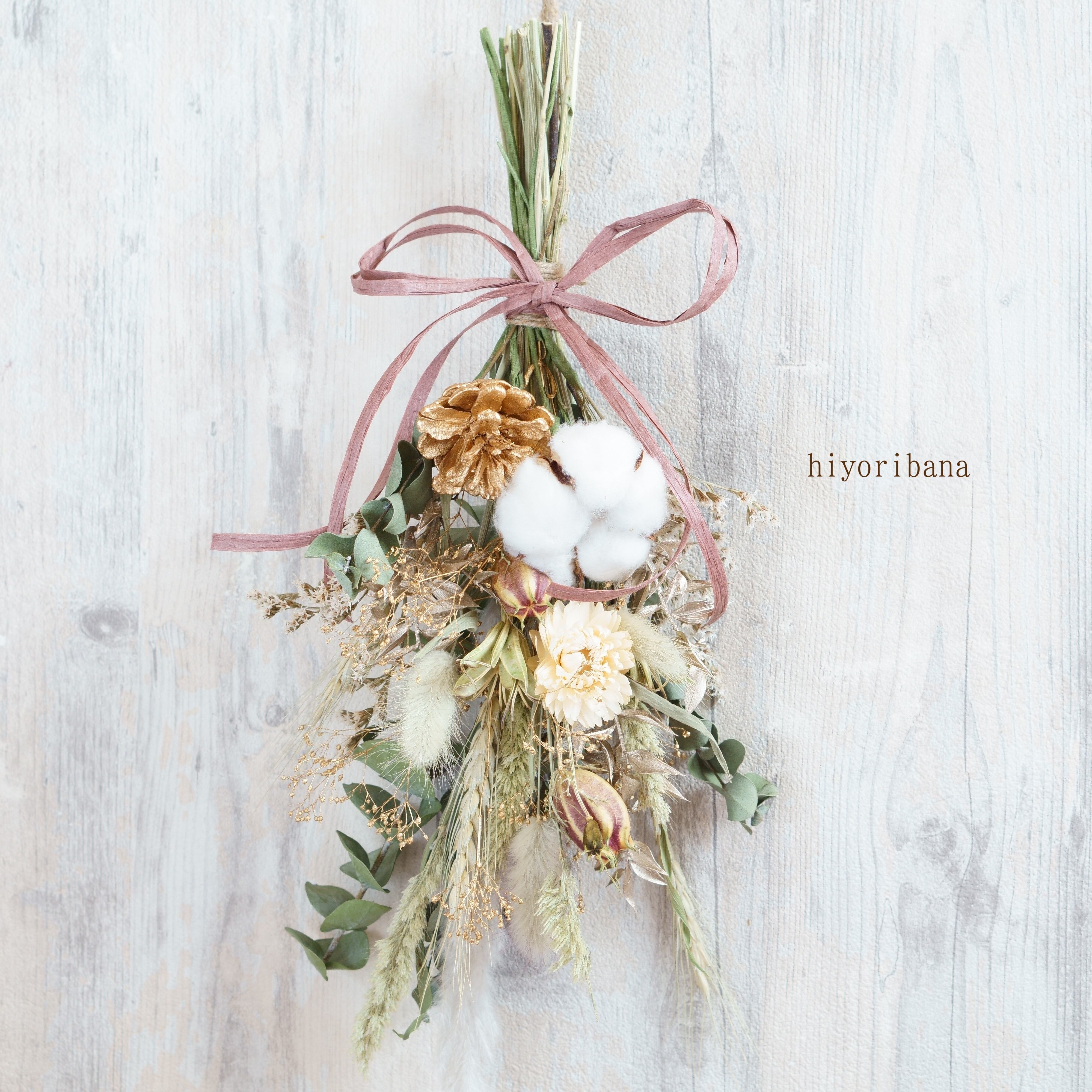 この冬をずっと一緒に過ごしていただきたいという想いから、長く飾れるドライフラワーのお飾りスワッグをつくりました。