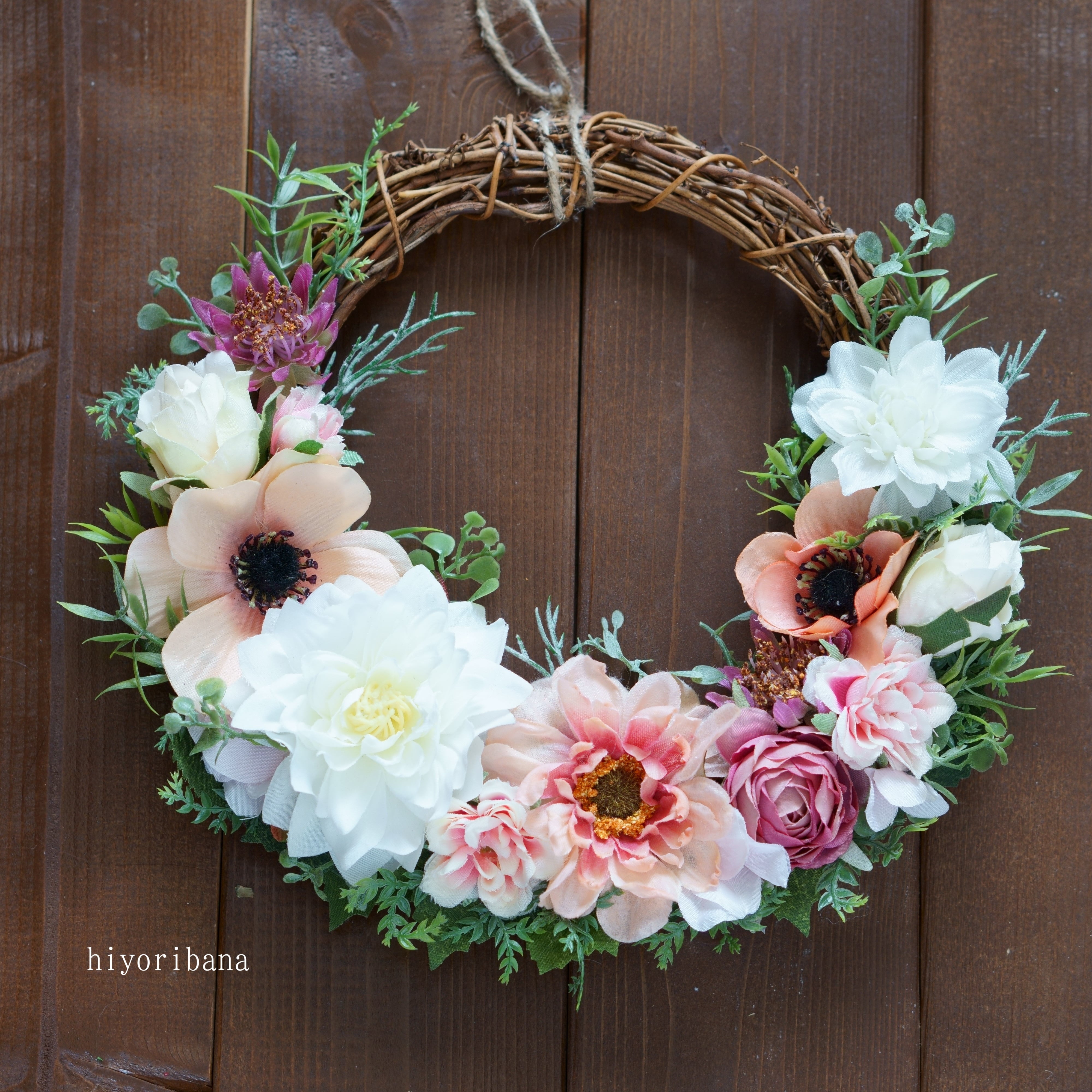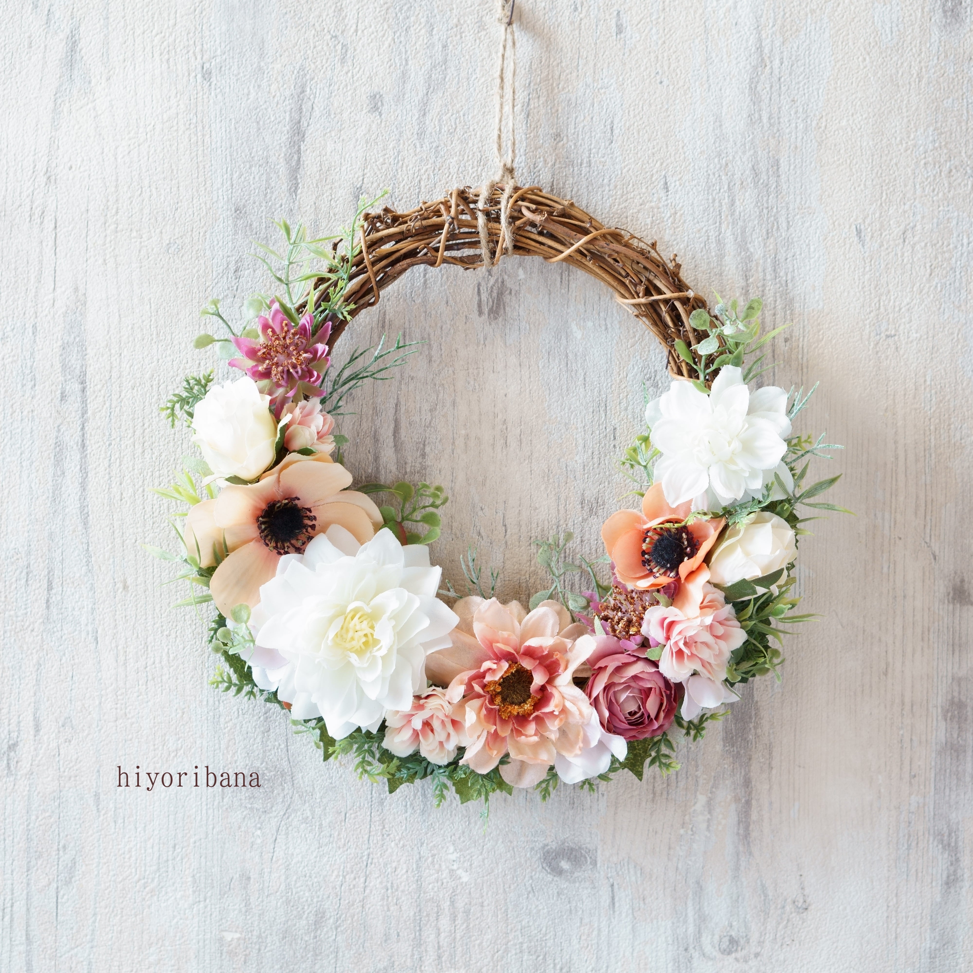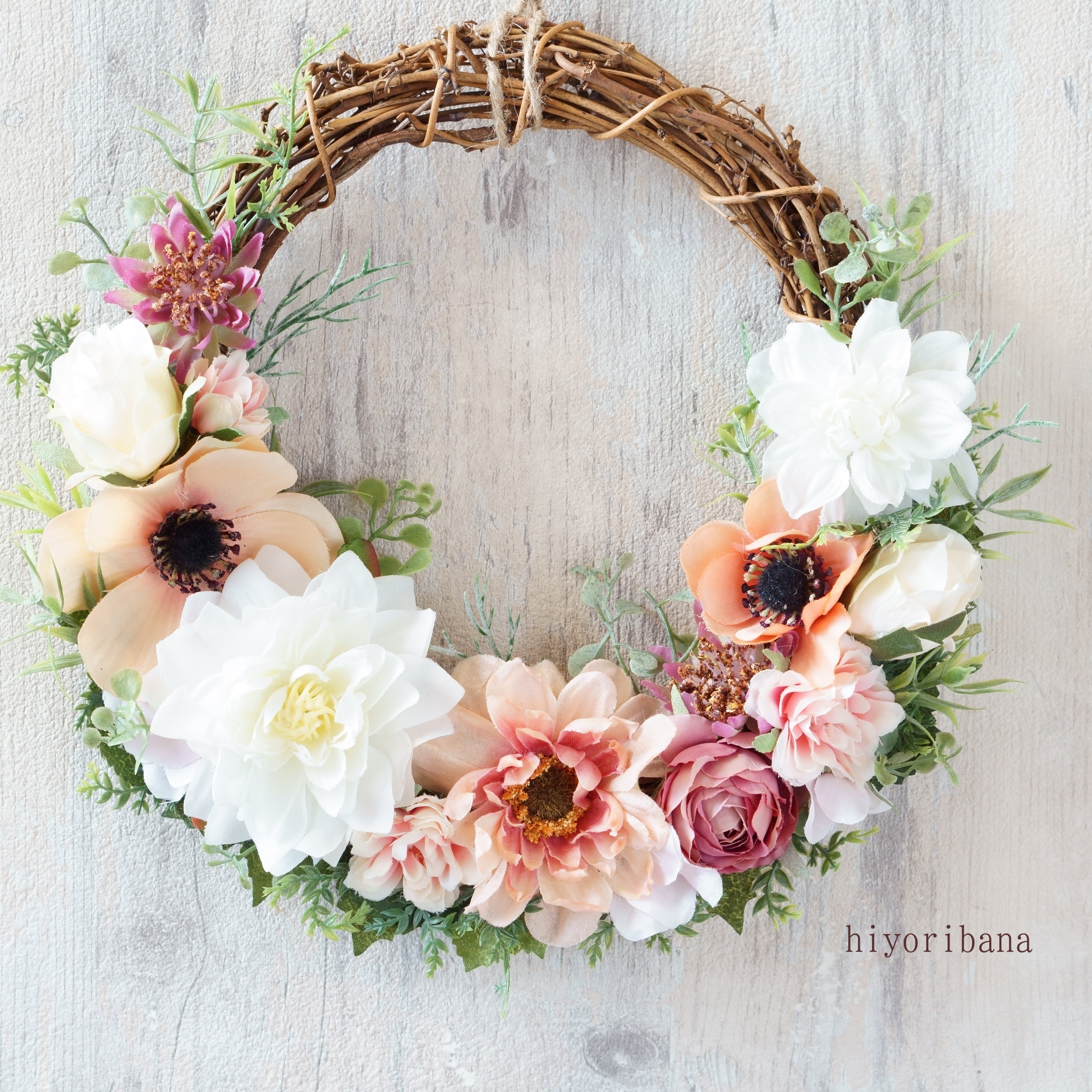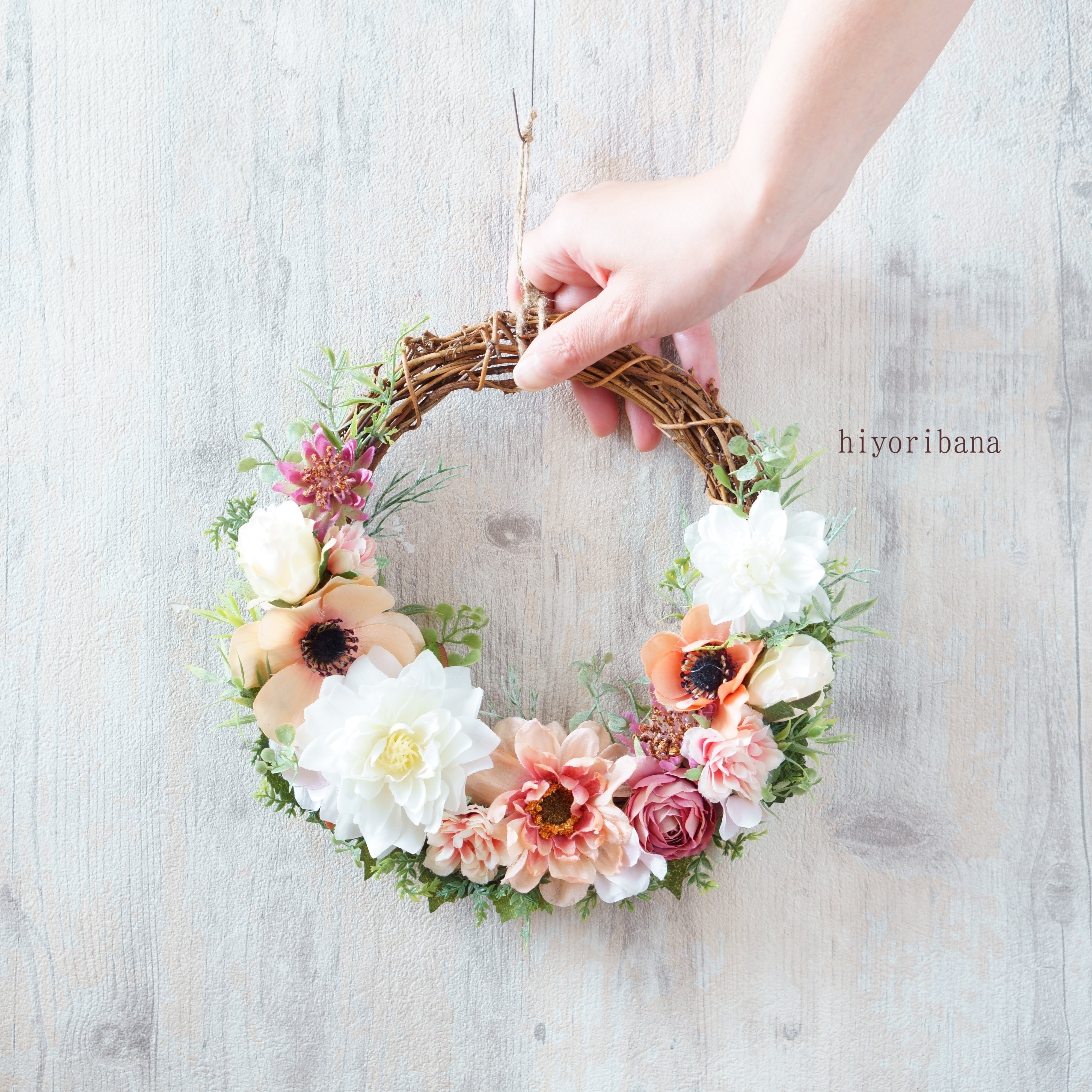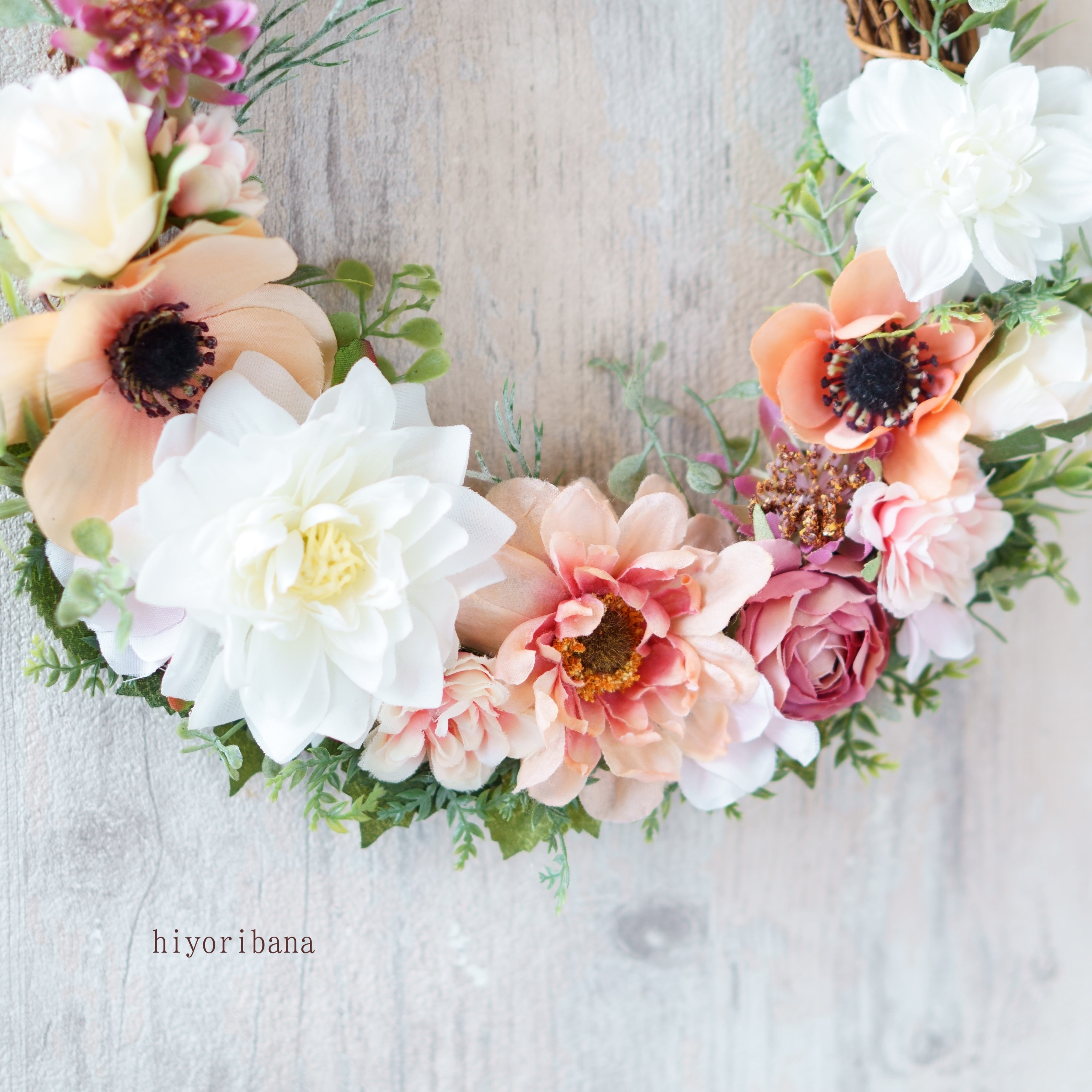 優しいピーチとホワイトでまとめた、アーティフィシャルフラワーのスプリングリースです。