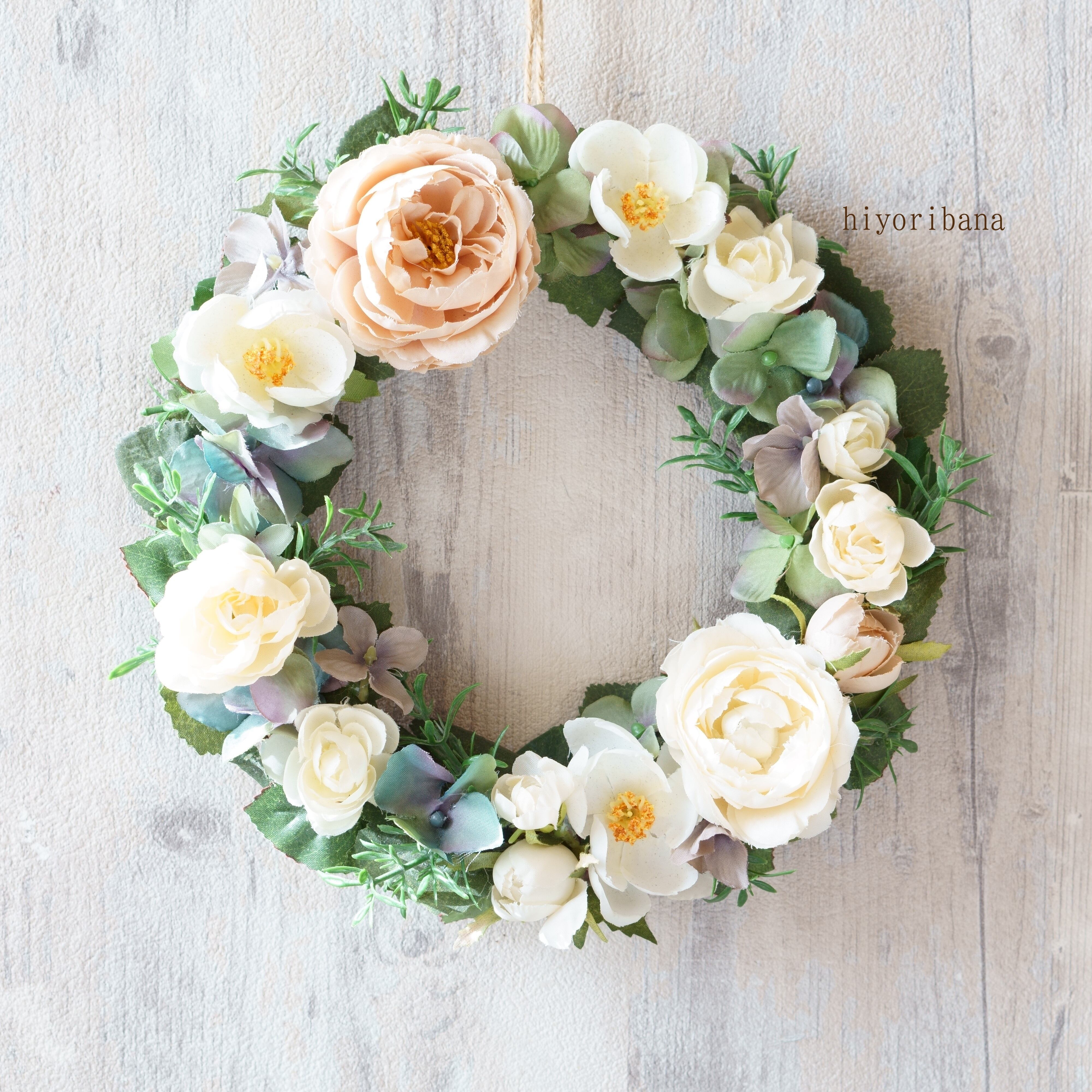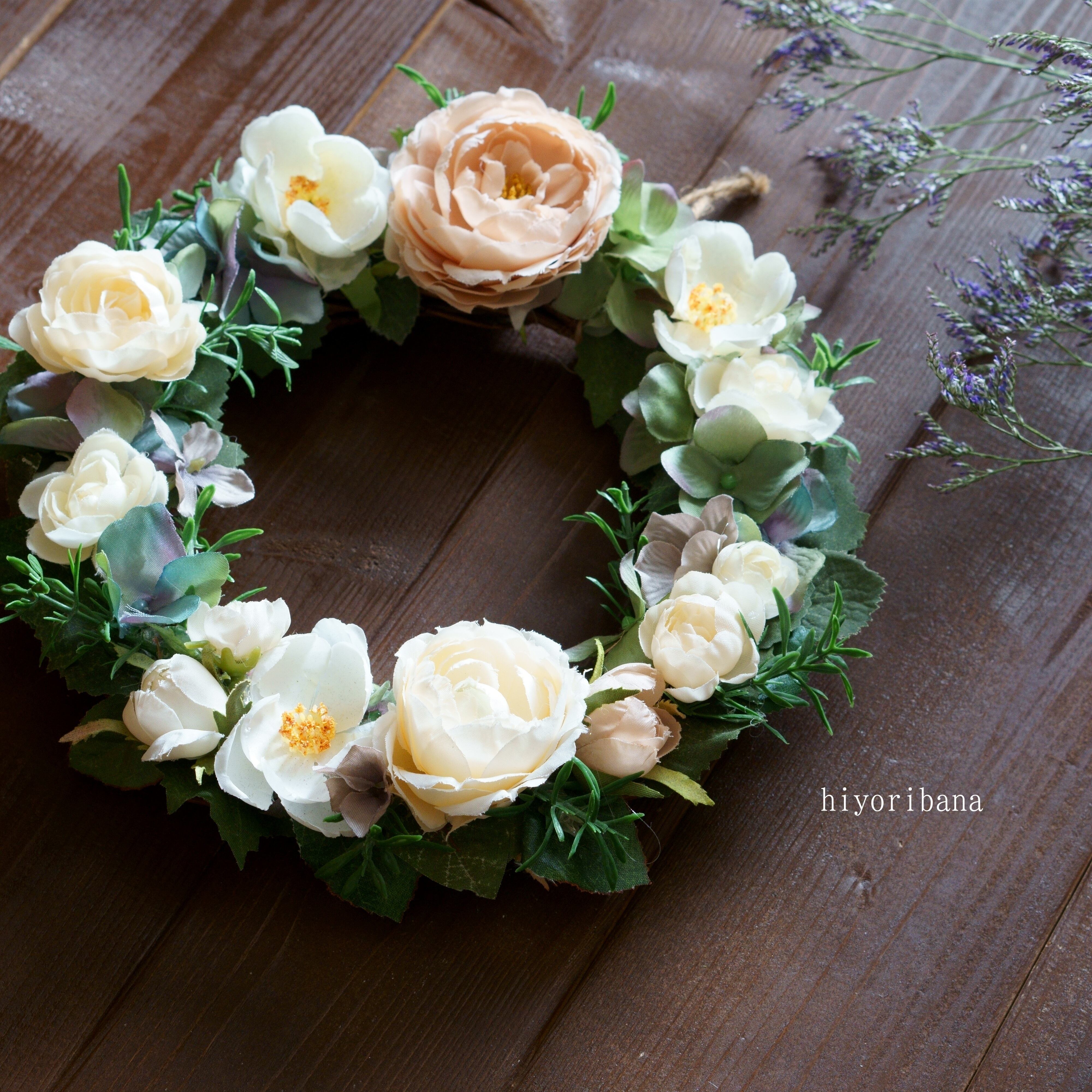 春のイングリッシュガーデンをイメージし、ホワイトからベージュのバラでまとめたリースです。