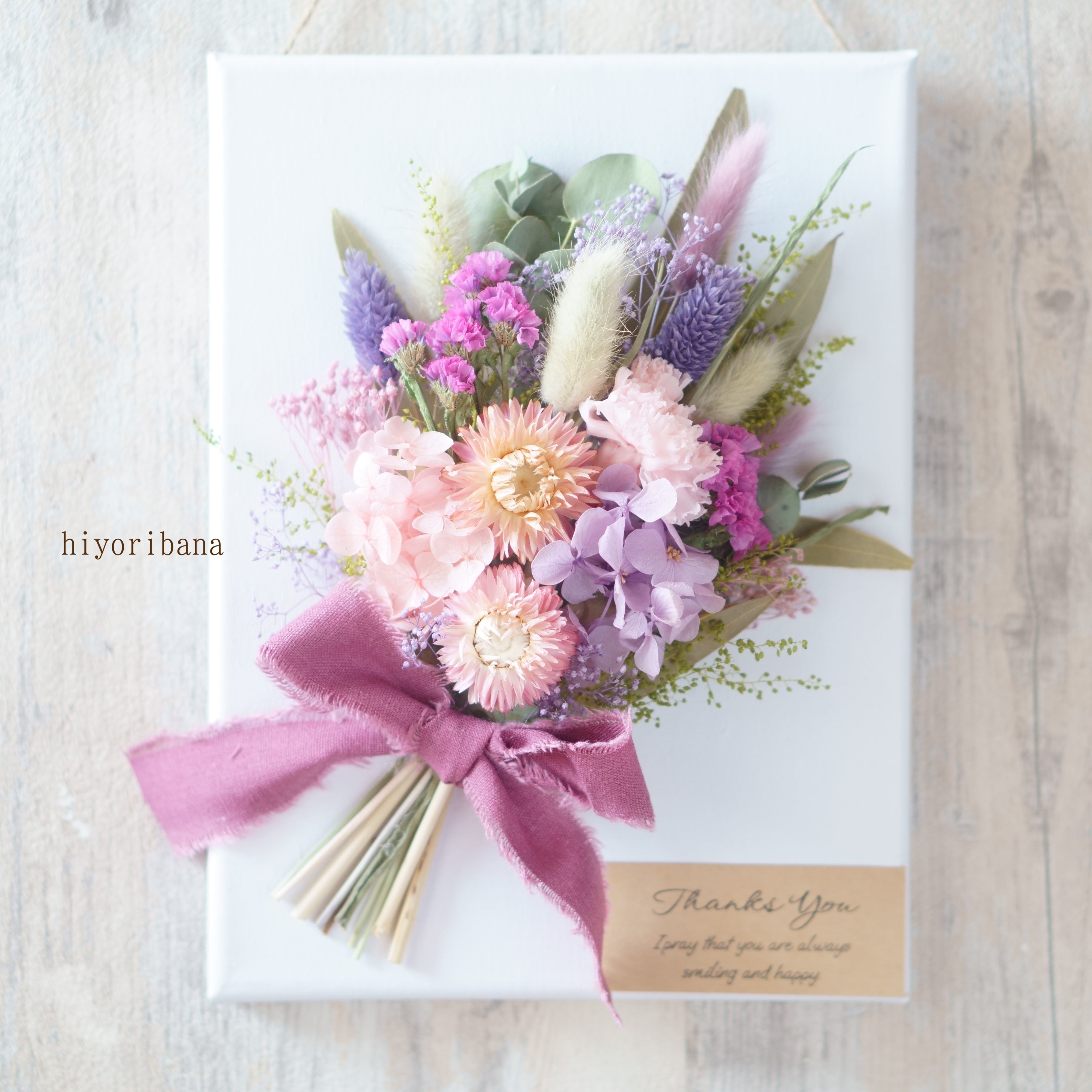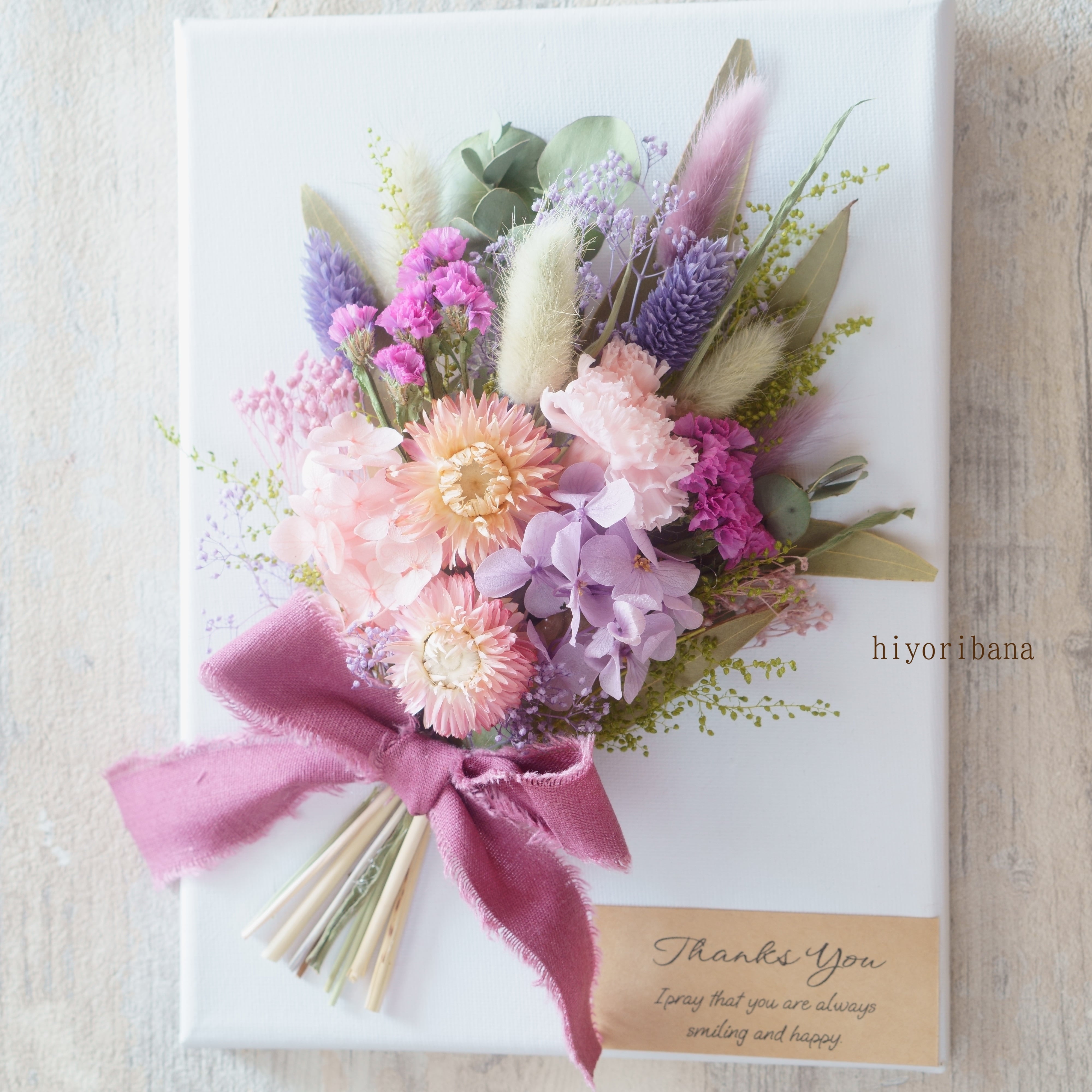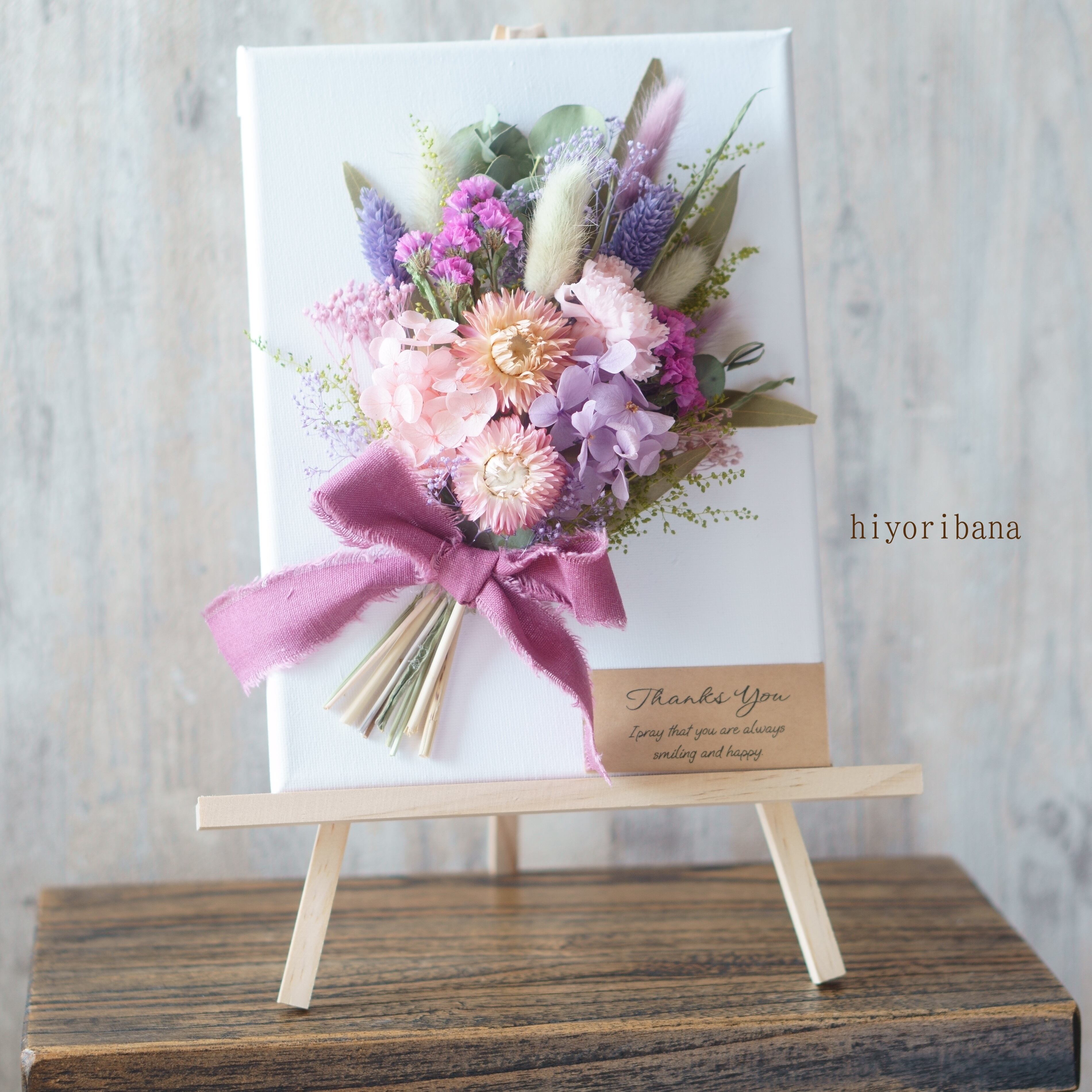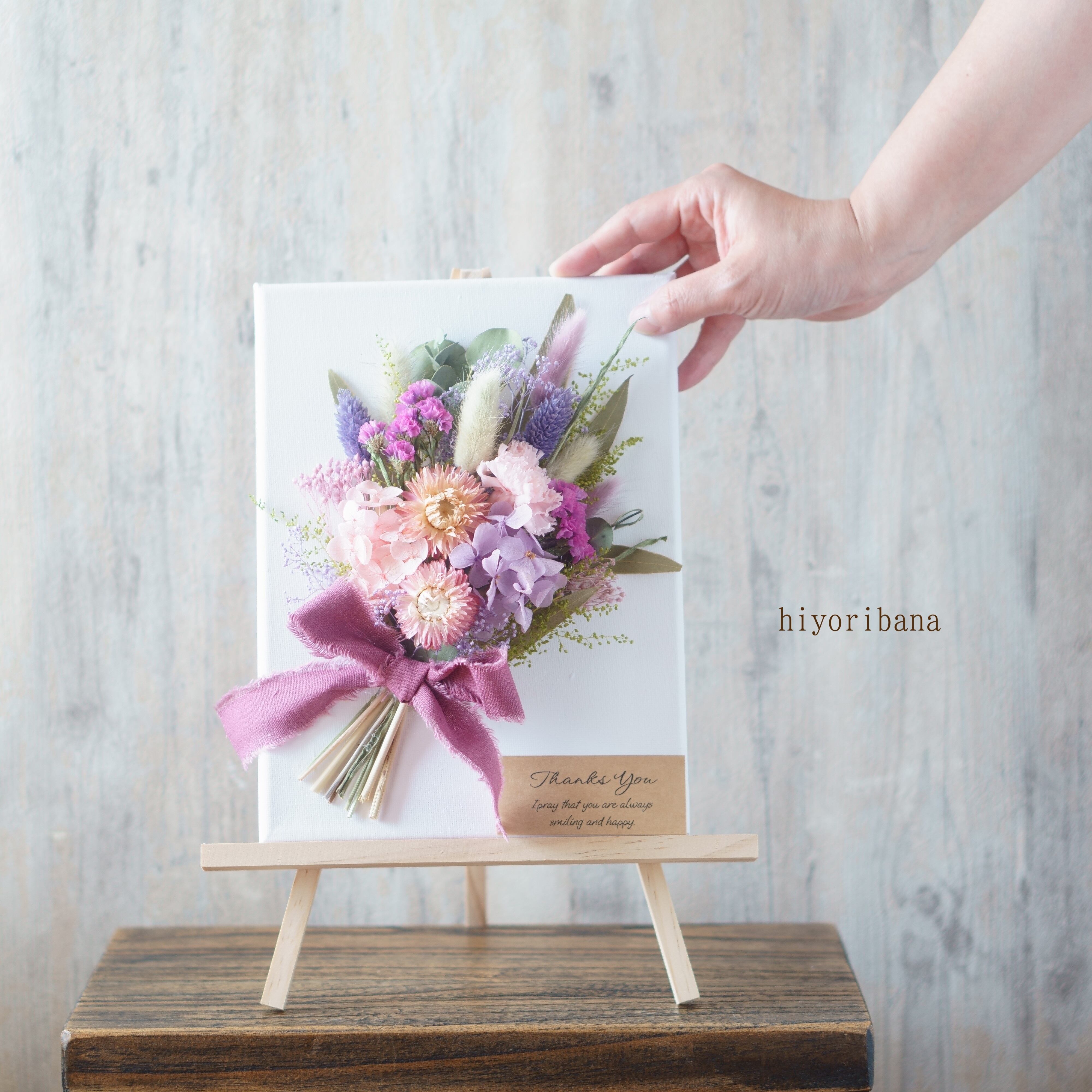 淡いピンクやラベンダーの花々を束ねた、母の日にピッタリのキャンバスフレームフラワーです。