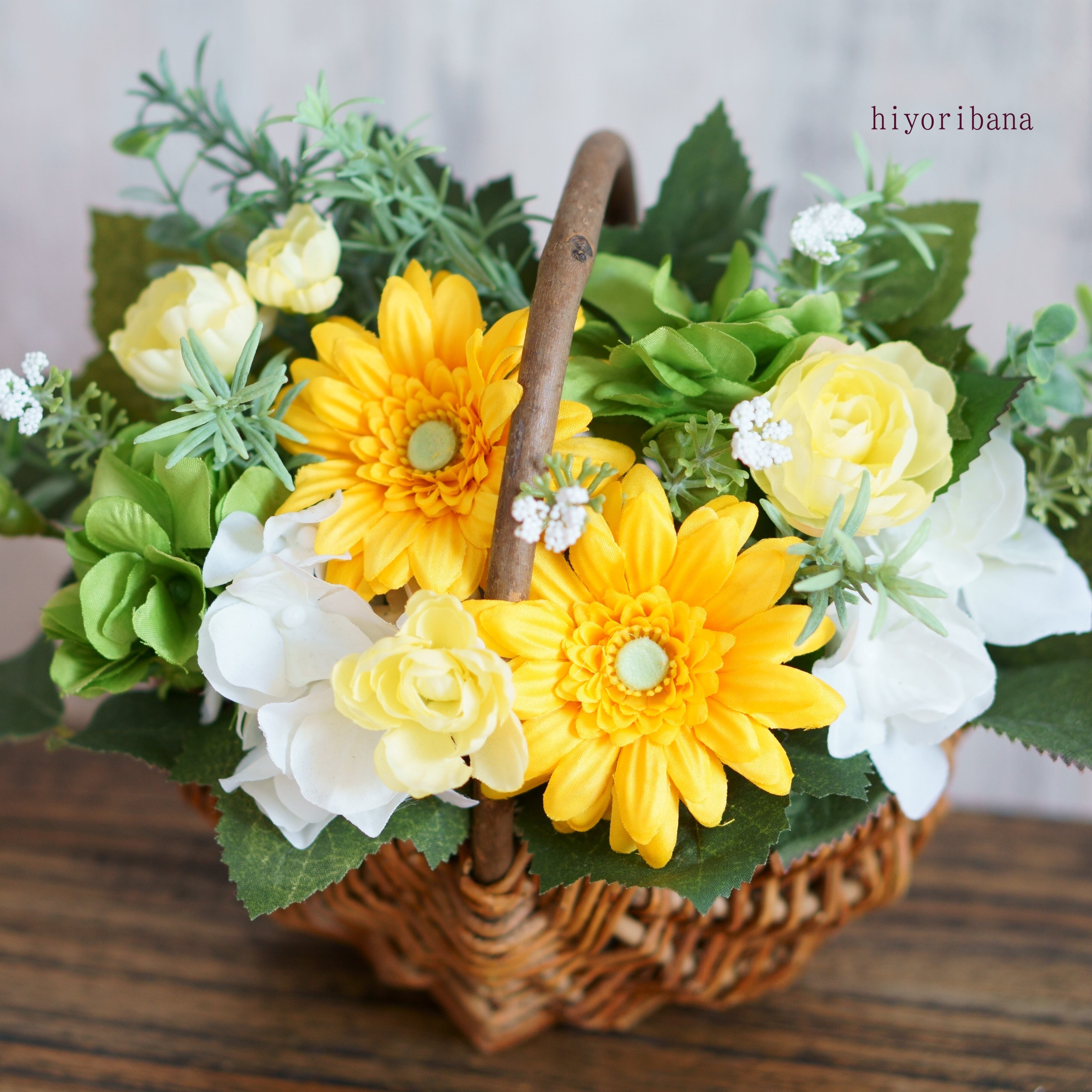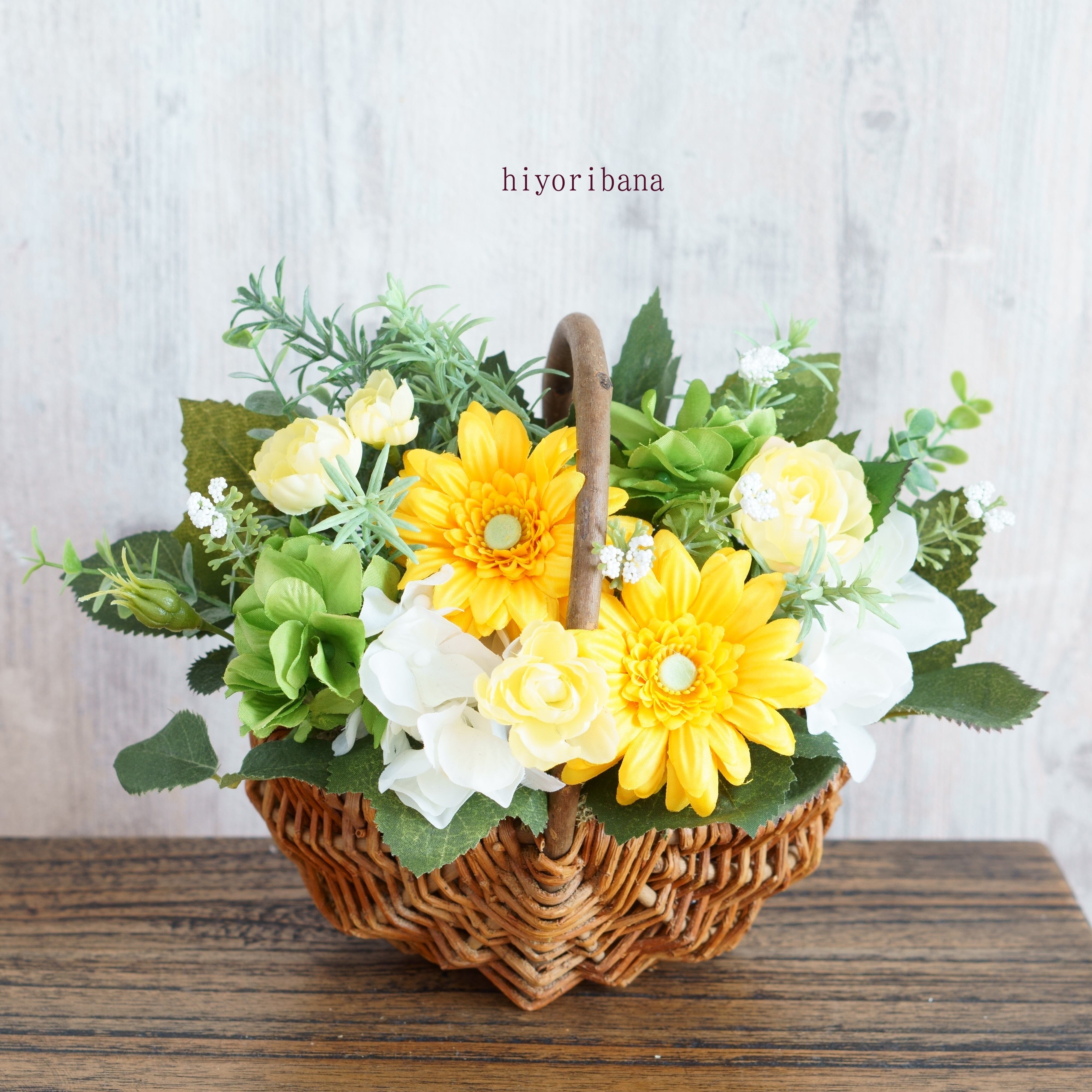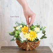 お庭で摘んできた花をバサッと入れたような、ナチュラルでかわいらしい花かごアレンジメントです。