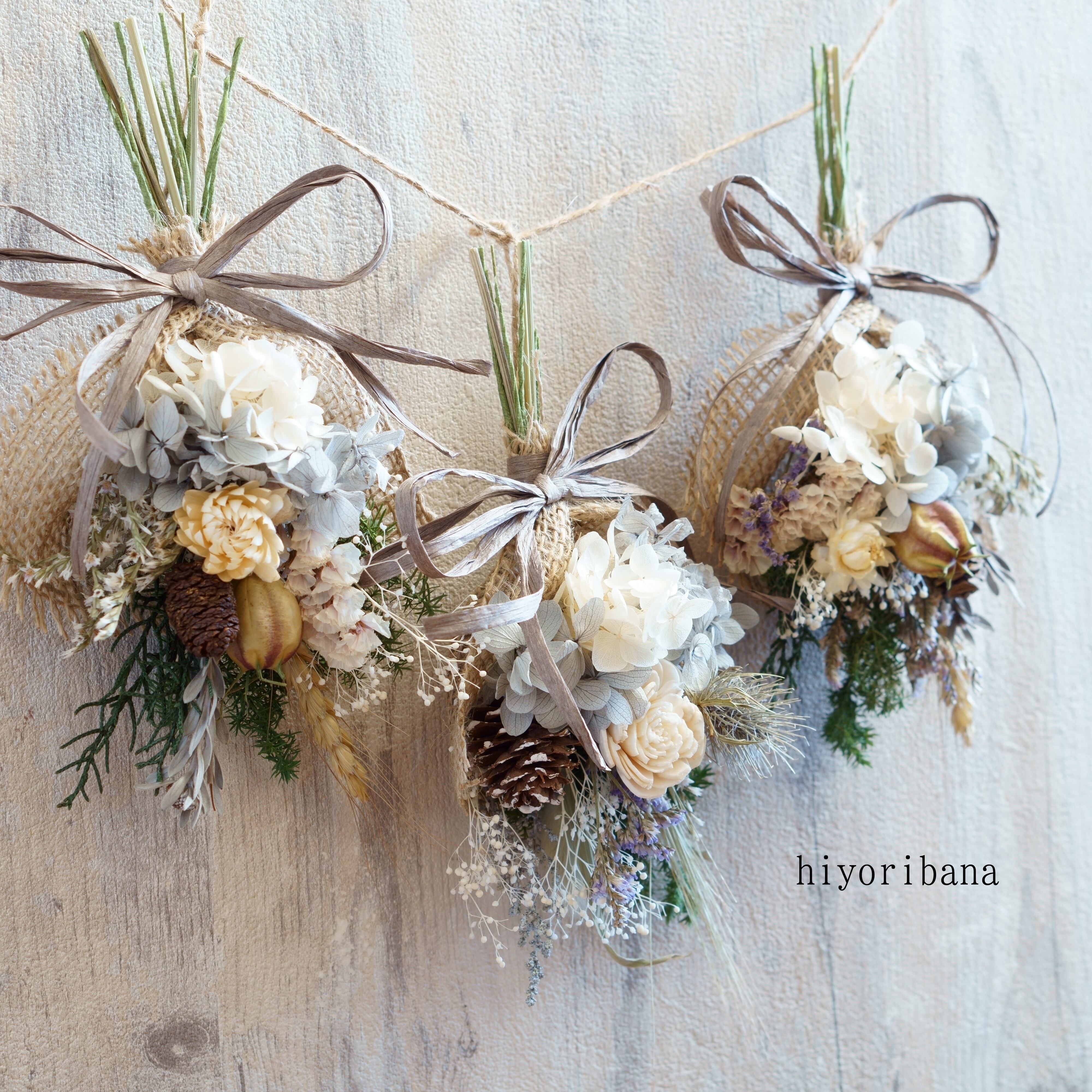 落ち着いた雰囲気で人気のグレイッシュカラーでまとめた、ドライフラワーとプリザーブドフラワーのミニスワッグ3つセットのガーランドです。