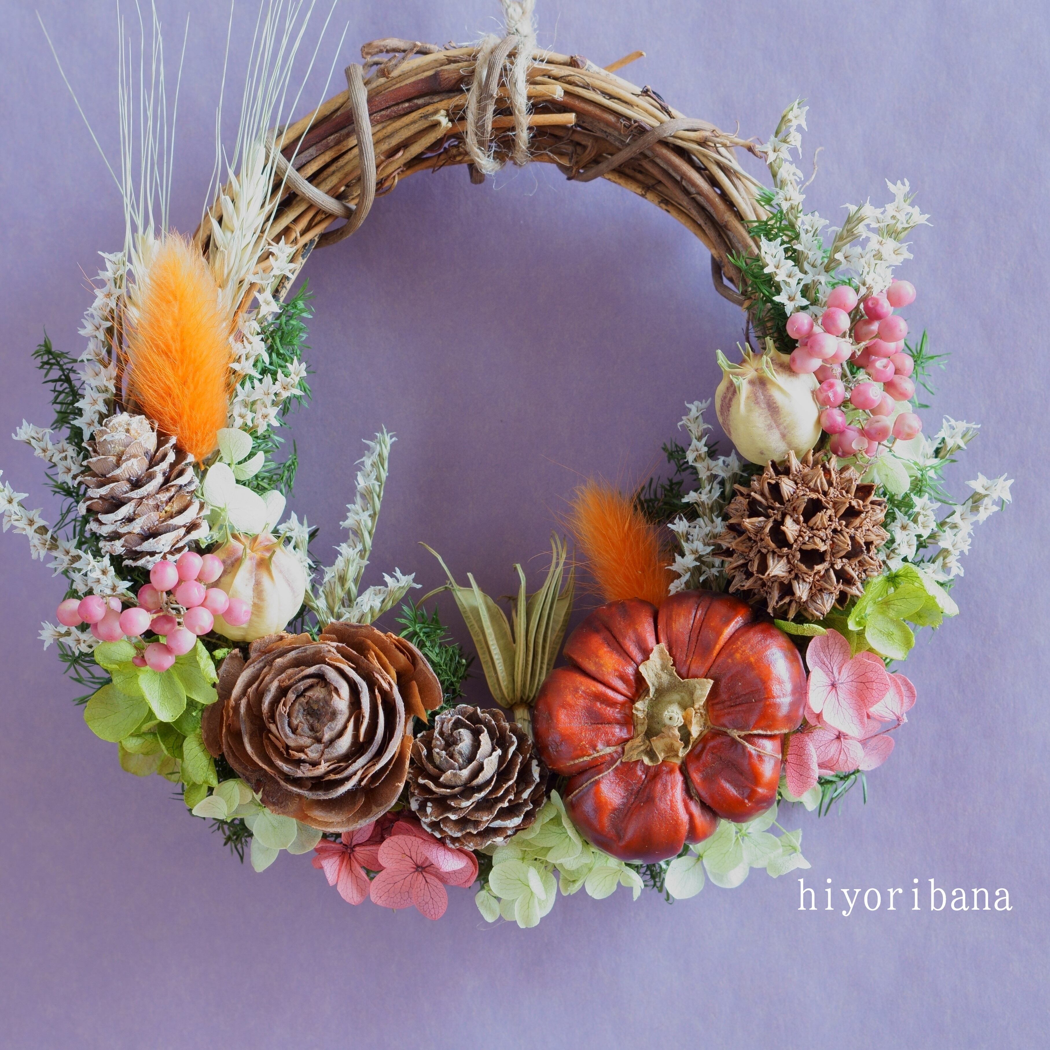 田舎の小さな村の収穫祭をイメージした、可愛らしいサイズのドライフラワーとプリザーブドフラワーのリースです。